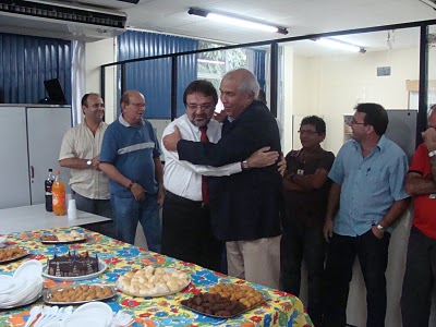 Mauricio (de gravata vermelha), em dezembro/2010, é abraçado pelo então presidente Eduardo Ribeiro, por ocasião de seu aniversário, festejado junto aos seus colegas de trabalho da Diretoria Financeira.
