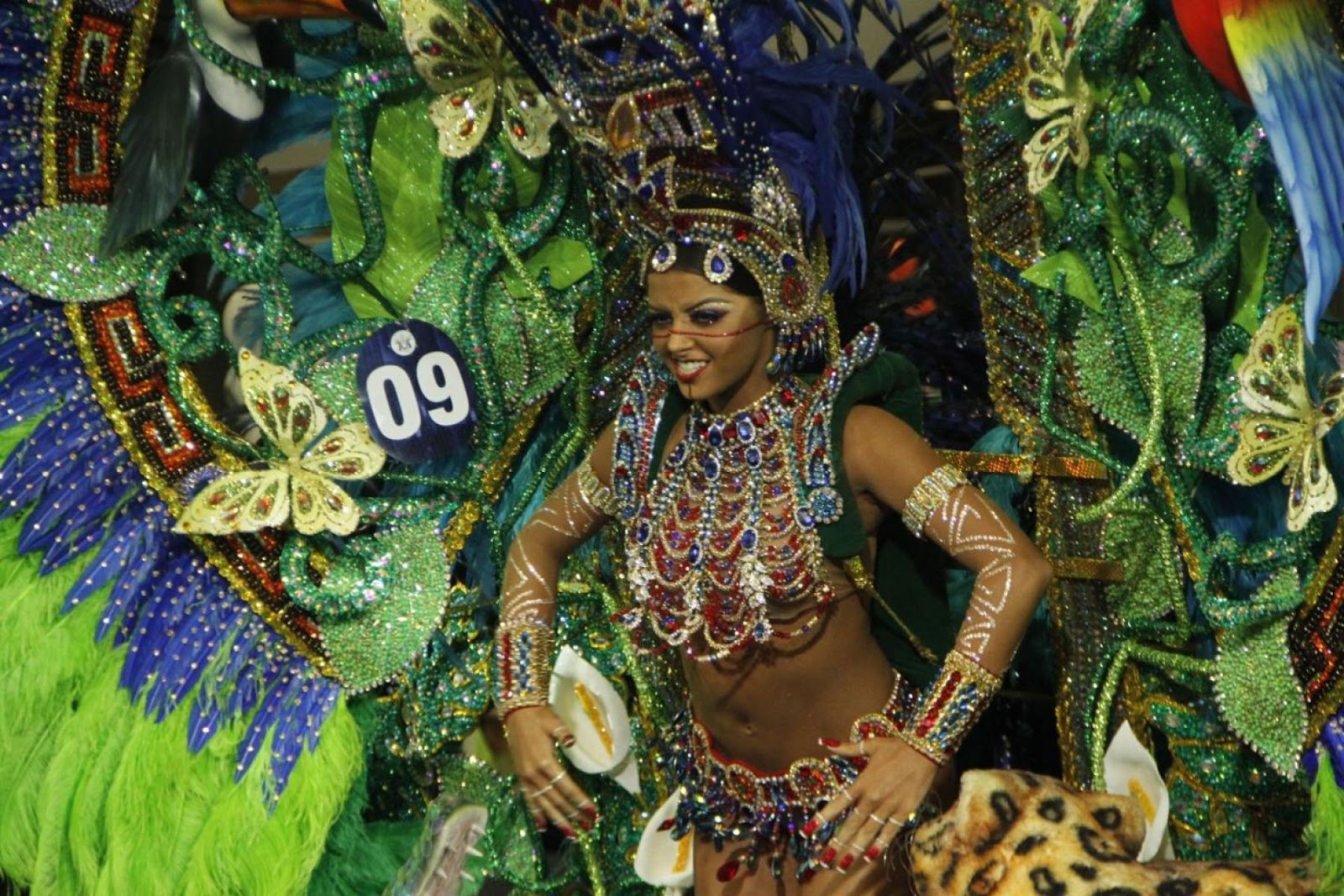 traje indígena tupinambá, com colar e saiote em cristais e semi-joias.